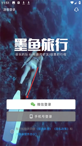 1、登錄界面墨魚(yú)旅行提供微信和手機(jī)號(hào)登錄方式,強(qiáng)調(diào)有會(huì)玩的隊(duì)長(zhǎng)、有趣的驢友與創(chuàng)意行程,登錄前需同意相關(guān)協(xié)議。
