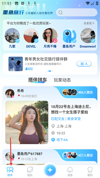 2、搭伴板塊平臺(tái)精選優(yōu)質(zhì)玩家,有青年男女社交旅行搭伴群可加入,還有搭伴拼車(chē)動(dòng)態(tài),如10月22日去上海迪士尼找女搭子的邀約。