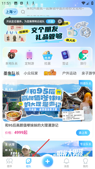 3、組隊(duì)板塊可開(kāi)啟定位找附近組隊(duì),有本地隊(duì)長(zhǎng)、定制游、撿漏等服務(wù),還推薦和95后高顏值嗲妹妹的大理漫游記,價(jià)格4999元起。