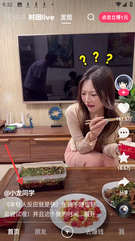 3、瀏覽至發(fā)現(xiàn)頁(yè)小龍同學(xué)的短視頻呈現(xiàn)眼前,畫面生動(dòng)文案提示生腌注意事項(xiàng),還設(shè)有點(diǎn)擊立得1元活動(dòng)。