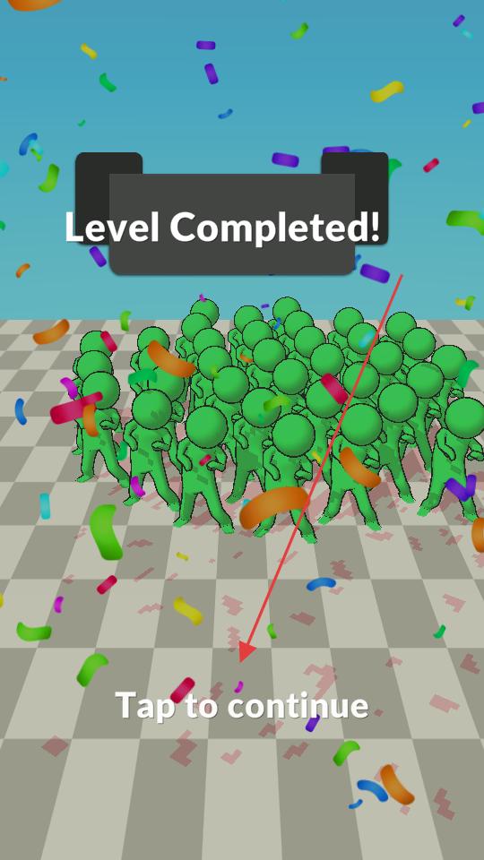 4、成功將小人隊(duì)伍引導(dǎo)至目標(biāo)區(qū)域后,關(guān)卡完成,界面顯示LevelCompleted,點(diǎn)擊屏幕繼續(xù),進(jìn)入后續(xù)關(guān)卡,重復(fù)匯聚小人、引導(dǎo)轉(zhuǎn)向的操作。