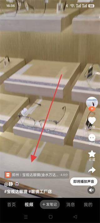 2、進入視頻板塊可觀看如眼鏡店的視頻內(nèi)容,了解店鋪信息,同時可進行點贊、評論、收藏、分享等互動操作。