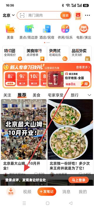 1、可在首頁瀏覽推薦內(nèi)容,如北京最大山姆開業(yè)信息、美食推薦等,點擊登錄按鈕登錄賬號后可發(fā)現(xiàn)更多好去處。