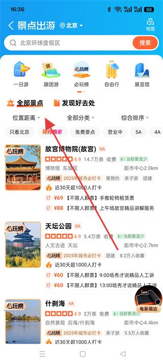 3、切換到景點出游板塊可查看北京的全部景點,如故宮博物院、天壇公園等,根據(jù)位置距離、綜合排序等篩選條件,選擇心儀的景點出游。