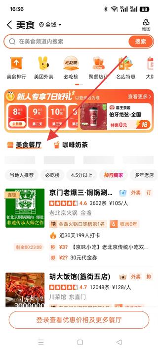 4、進入美食板塊可瀏覽美食餐廳、咖啡奶茶等分類,查看新人專享福利和各類美食推薦,選擇感興趣的餐廳或美食,了解優(yōu)惠信息和用戶評價,滿足美食需求。