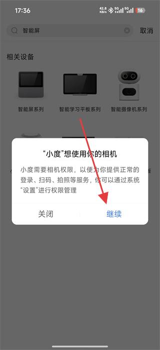 4、當(dāng)軟件請(qǐng)求使用相機(jī)權(quán)限時(shí),點(diǎn)擊繼續(xù)按鈕,授予相機(jī)權(quán)限,以便進(jìn)行設(shè)備的掃碼添加等操作,完成智能設(shè)備的添加流程。