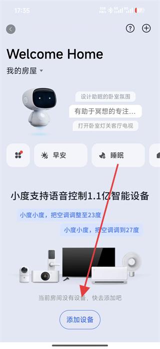 1、進(jìn)入我的房屋頁(yè)面,若當(dāng)前房間沒(méi)有設(shè)備,點(diǎn)擊添加設(shè)備按鈕,進(jìn)入設(shè)備搜索頁(yè)面。