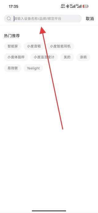 2、在設(shè)備搜索頁(yè)面可在搜索欄輸入設(shè)備名稱、品牌或綁定平臺(tái),也可查看熱門推薦的設(shè)備品牌,如小度音箱、美的等。