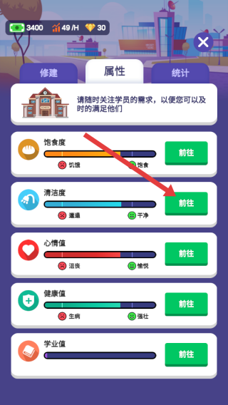3、屬性界面能看到飽食度、清潔度等學生相關屬性,若清潔度等屬性不佳,可點擊前往去進行改善操作。