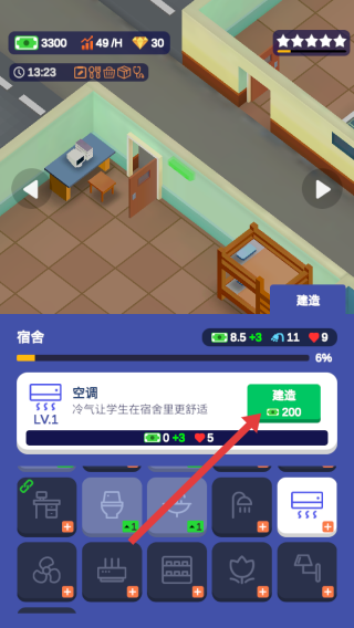 2、進入宿舍建造界面,可選擇建造空調等設施,比如花費200資源建造LV1空調,讓學生宿舍更舒適,提升宿舍品質。