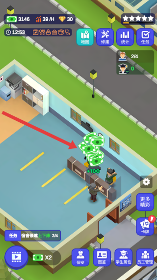 1、校園場景的相關區(qū)域,可進行招收學生操作獲取金幣,像招收一個能獲得100的金幣獎勵,積累校園經(jīng)營的資金。