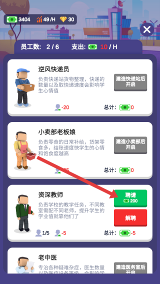 4、員工管理界面,有不同類型的員工,如資深教師,可花費200資源聘請,讓其負責教學任務,提升學生學業(yè)值等。