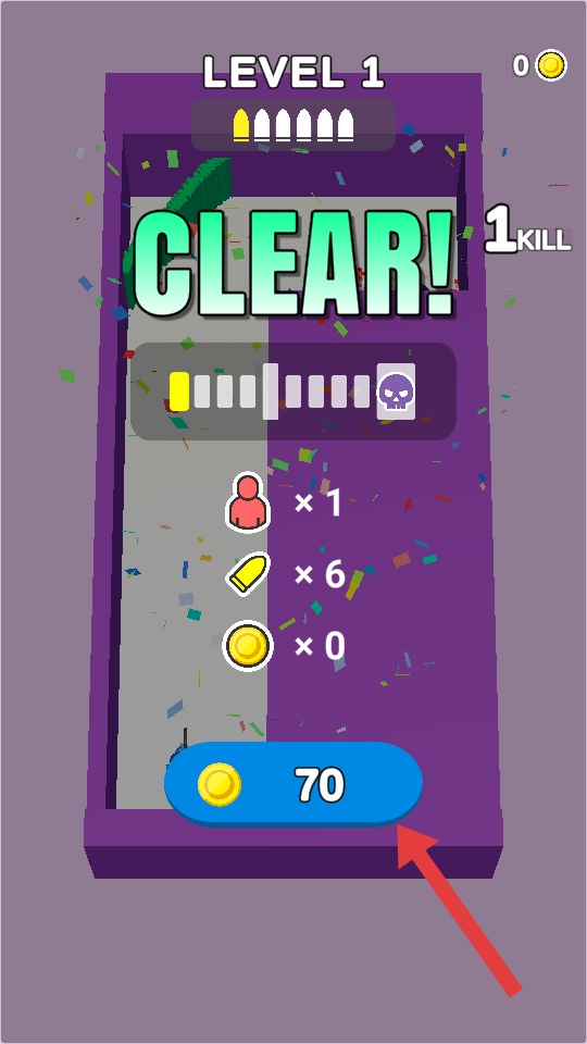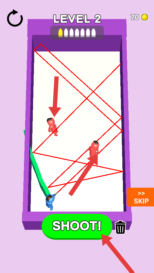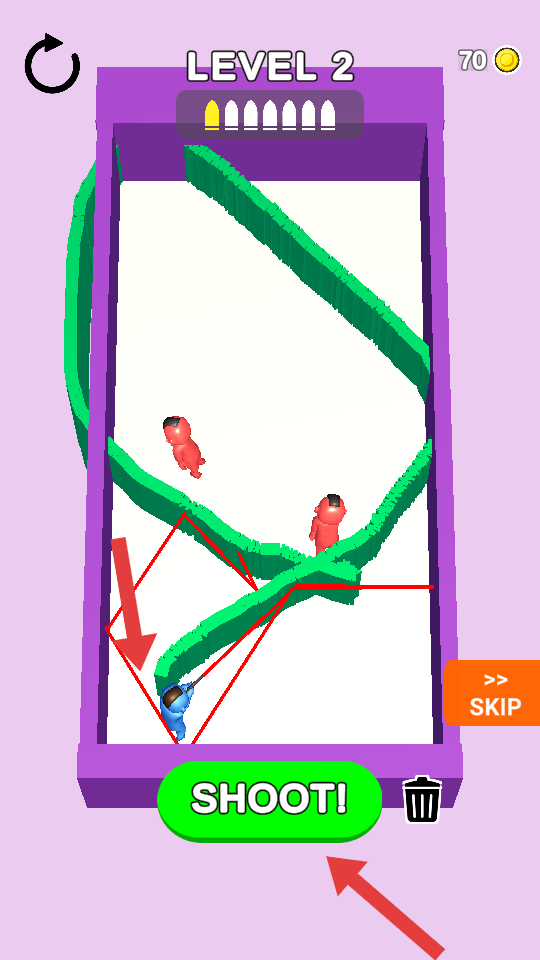 3、確定好射擊路線后,點(diǎn)擊SHOOT按鈕,發(fā)射子彈,讓子彈沿著規(guī)劃的路線飛行,去擊中紅色角色,完成擊殺目標(biāo)。