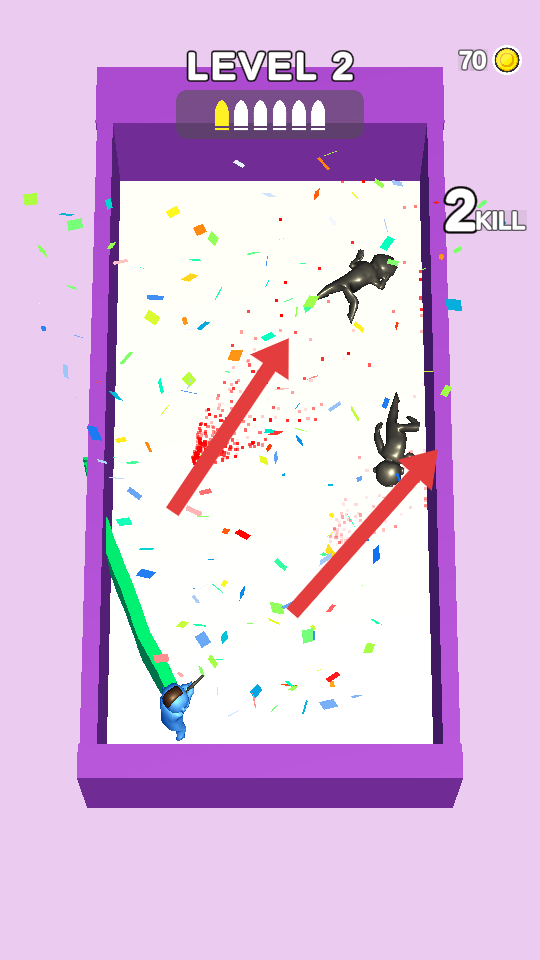 4、成功擊中紅色角色后,界面會(huì)顯示擊殺數(shù)量,還有彩色碎片特效,完成本關(guān)擊殺任務(wù),繼續(xù)挑戰(zhàn)后續(xù)關(guān)卡。