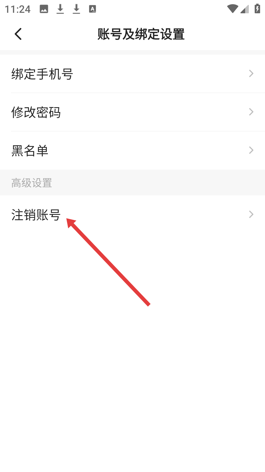 2、進(jìn)入賬號(hào)及綁定設(shè)置界面后,在高級(jí)設(shè)置板塊中找到注銷賬號(hào)選項(xiàng),點(diǎn)擊該選項(xiàng)系統(tǒng)會(huì)跳轉(zhuǎn)至注銷說(shuō)明頁(yè)面,正式開(kāi)啟賬號(hào)注銷的流程。