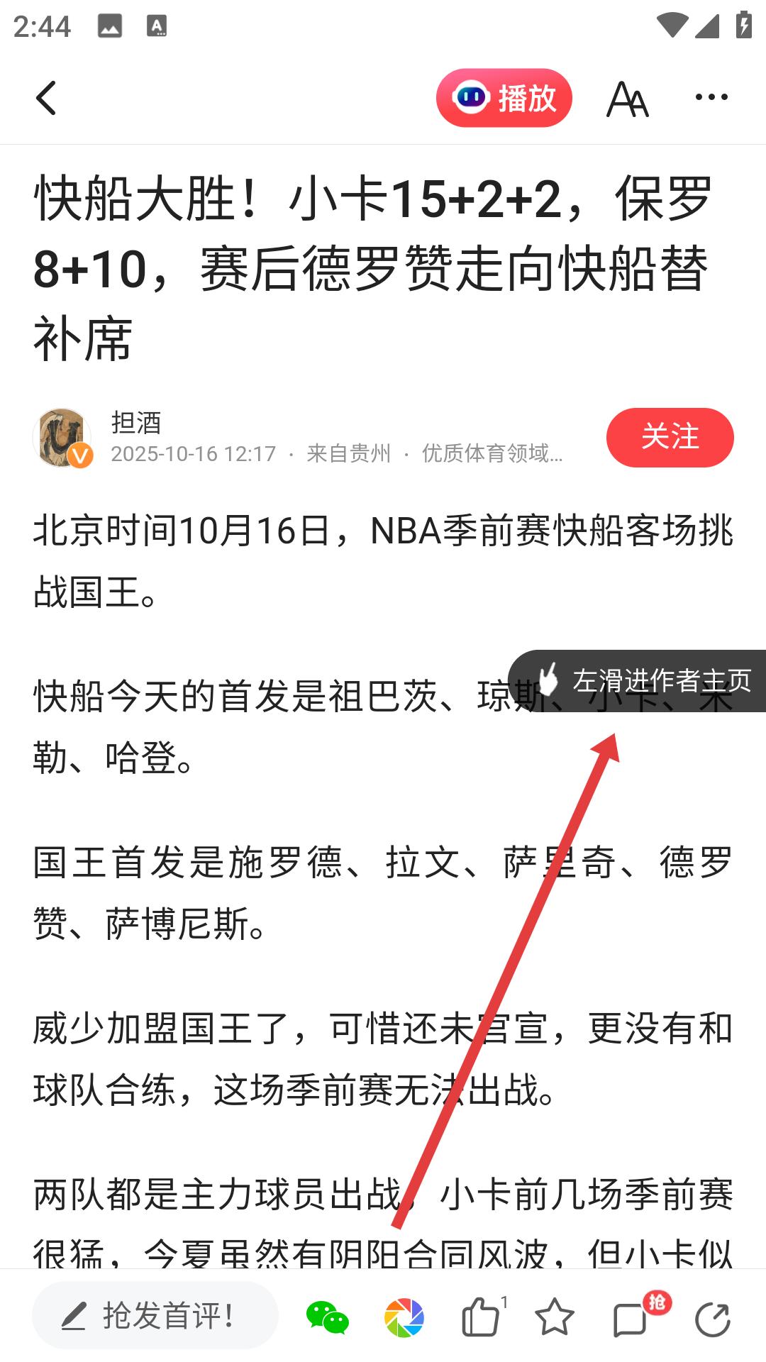 2、在快船比賽新聞詳情頁(yè)面,查看新聞內(nèi)容,了解比賽相關(guān)信息,按照提示進(jìn)行左滑操作,進(jìn)入與該新聞相關(guān)的互動(dòng)界面。