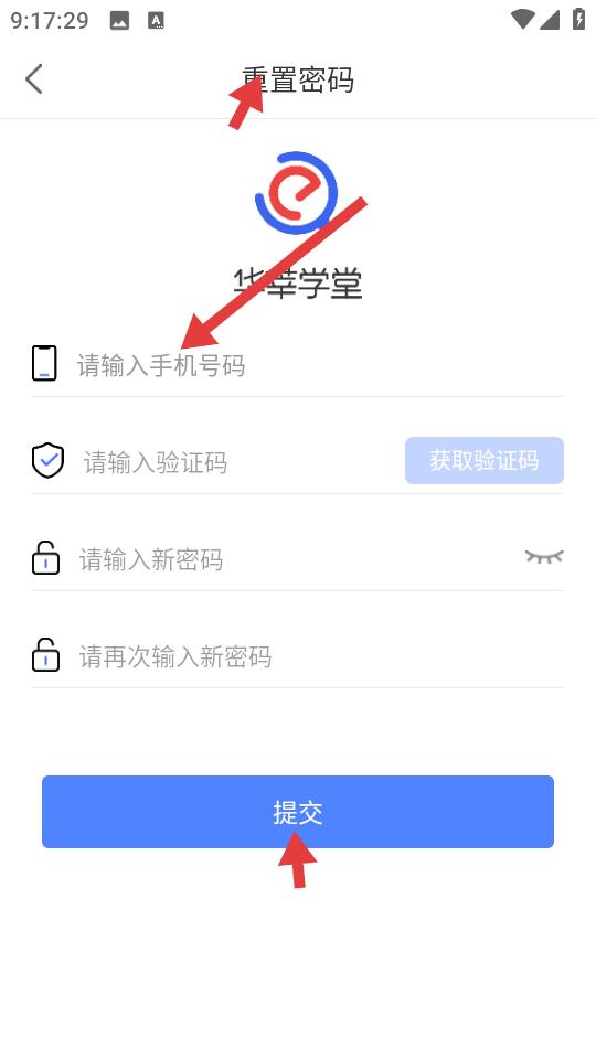 3、忘記密碼時(shí)進(jìn)入重置密碼頁面,先填寫手機(jī)號(hào),點(diǎn)擊獲取驗(yàn)證碼填入校驗(yàn)碼,隨后設(shè)定并確認(rèn)新密碼,完成后點(diǎn)擊提交按鈕,即可完成密碼重置。