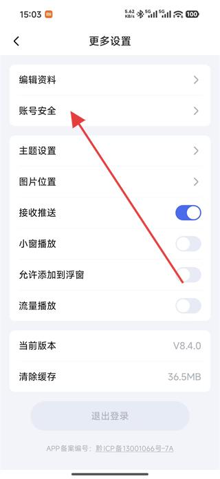 1、進(jìn)入軟件更多設(shè)置頁(yè)面,在該頁(yè)面中可看到編輯資料、賬號(hào)安全、主題設(shè)置等多項(xiàng)功能選項(xiàng),找到并點(diǎn)擊賬號(hào)安全,進(jìn)入賬號(hào)安全設(shè)置界面。