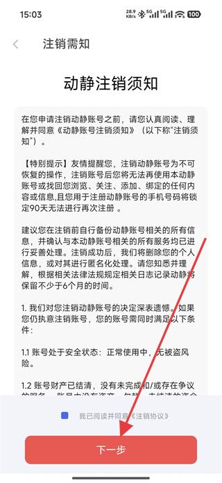 3、在注銷需知頁(yè)面仔細(xì)閱讀動(dòng)靜注銷須知,勾選我已閱讀并同意注銷協(xié)議后,點(diǎn)擊下一步進(jìn)入手機(jī)驗(yàn)證頁(yè)面。