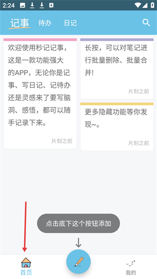 1、首頁(yè)有記事、待辦、日記標(biāo)簽,可記錄各類內(nèi)容,長(zhǎng)按能批量管理筆記,點(diǎn)擊底部按鈕可添加新筆記。