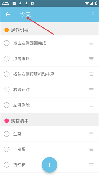 2、今天待辦頁(yè)有操作引導(dǎo)和購(gòu)物清單,可標(biāo)記完成、編輯、排序,右滑計(jì)時(shí)、左滑刪除,方便管理當(dāng)日任務(wù)。