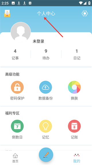 4、個(gè)人中心頁(yè)顯示未登錄,有記事、待辦、日記數(shù)量,還有密碼保護(hù)、數(shù)據(jù)備份等功能及福利專區(qū)。