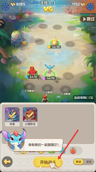 4、進(jìn)入戰(zhàn)斗界面,選擇出戰(zhàn)寵物,點(diǎn)擊開始戰(zhàn)斗,和寵物一起與敵人交鋒,展開狩獵戰(zhàn)斗。
