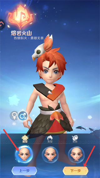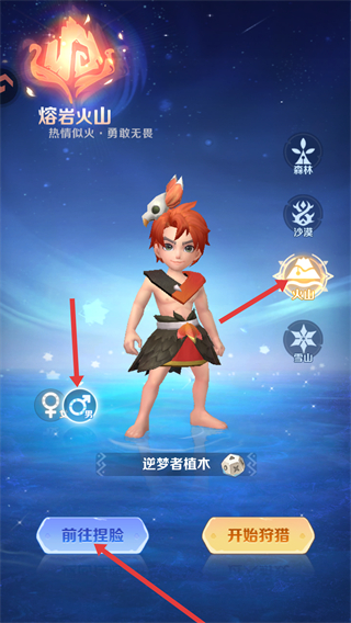 1、選擇熔巖火山等場景,確定角色性別,點(diǎn)擊前往捏臉,進(jìn)入角色捏臉環(huán)節(jié),打造專屬形象。