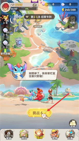3、進(jìn)入游戲地圖,看到主線關(guān)卡提示,點(diǎn)擊挑戰(zhàn),準(zhǔn)備開啟狩獵等主線任務(wù),推進(jìn)游戲劇情。