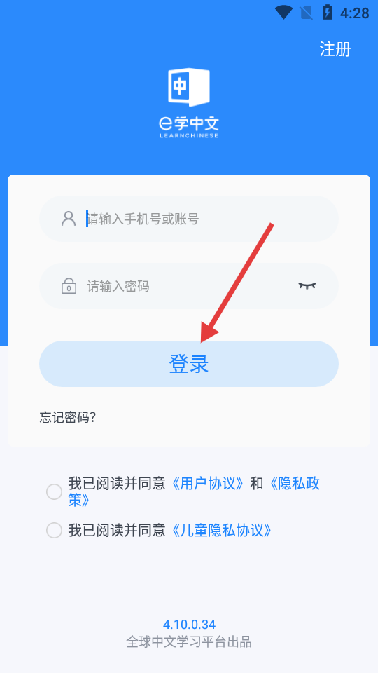 2、登錄頁面上方有APP標識,用戶可輸入手機號或賬號及密碼登錄,下方有忘記密碼功能和協(xié)議閱讀提示。