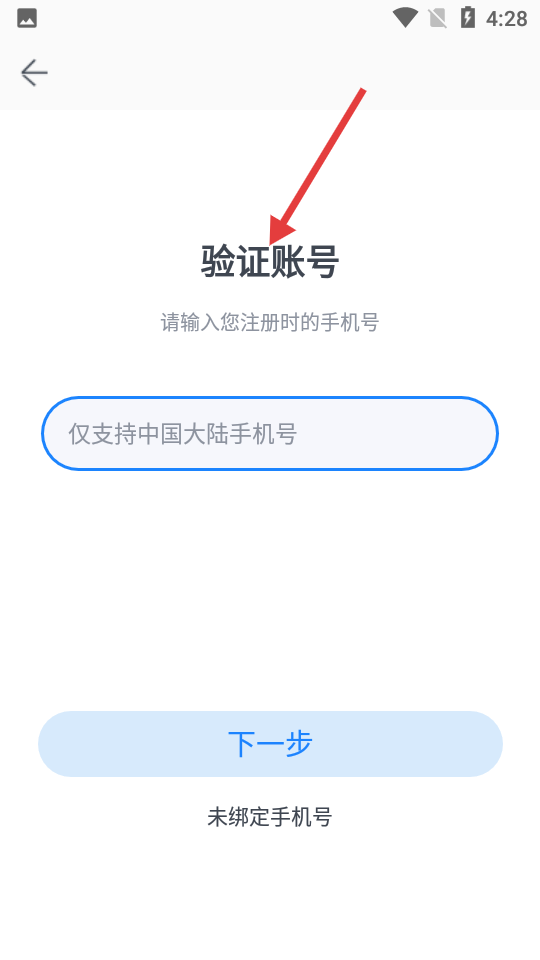 3、驗證賬號頁面明確僅支持中國大陸手機號,提示輸入注冊手機號,通過點擊下一步進行后續(xù)驗證流程。