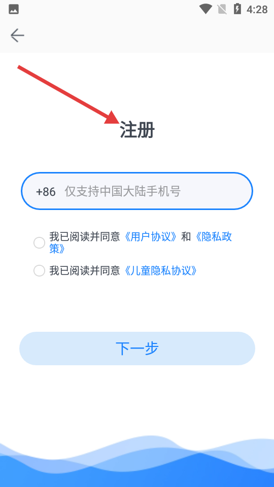 4、注冊頁面顯示注冊相關信息,僅支持中國大陸手機號注冊,需閱讀并同意用戶和隱私協(xié)議,方可點擊下一步注冊。