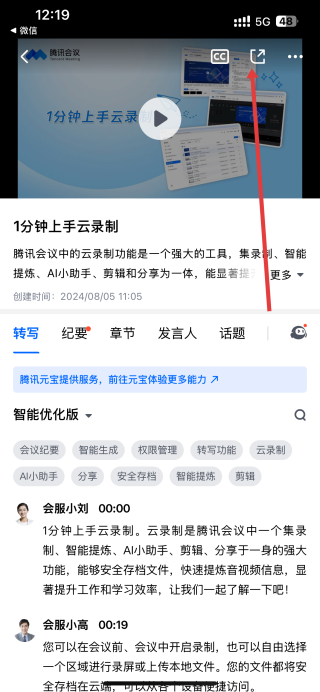 3、點擊1分鐘上手云錄制文件,進入詳情頁面,可看到文件相關(guān)介紹,還有轉(zhuǎn)寫、紀(jì)要等功能選項。