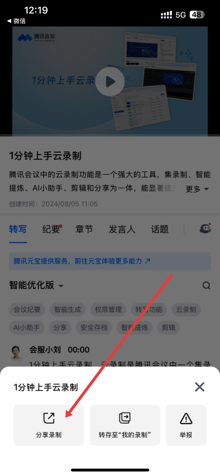 4、錄制文件詳情頁面,可進行分享錄制、轉(zhuǎn)存至我的錄制、舉報等操作,點擊分享錄制,可將文件分享出去。