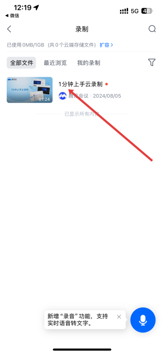2、進入錄制頁面,可看到全部文件、最近瀏覽、我的錄制等分類,能查看1分鐘上手云錄制等錄制文件。
