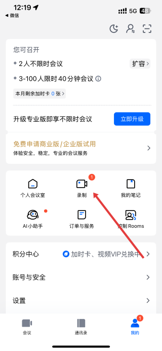 1、打開騰訊會議,進入我的頁面,能看到可召開的會議類型、剩余加時卡等,還有個人會議室、錄制等功能入口,點擊錄制。