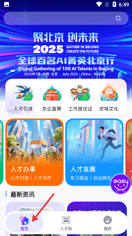 1、首頁(yè)聚焦北京人才服務(wù),以聚北京創(chuàng)未來(lái)為主題,展示2025年AI人才活動(dòng),設(shè)有人才引進(jìn)、京企直聘等功能板塊。