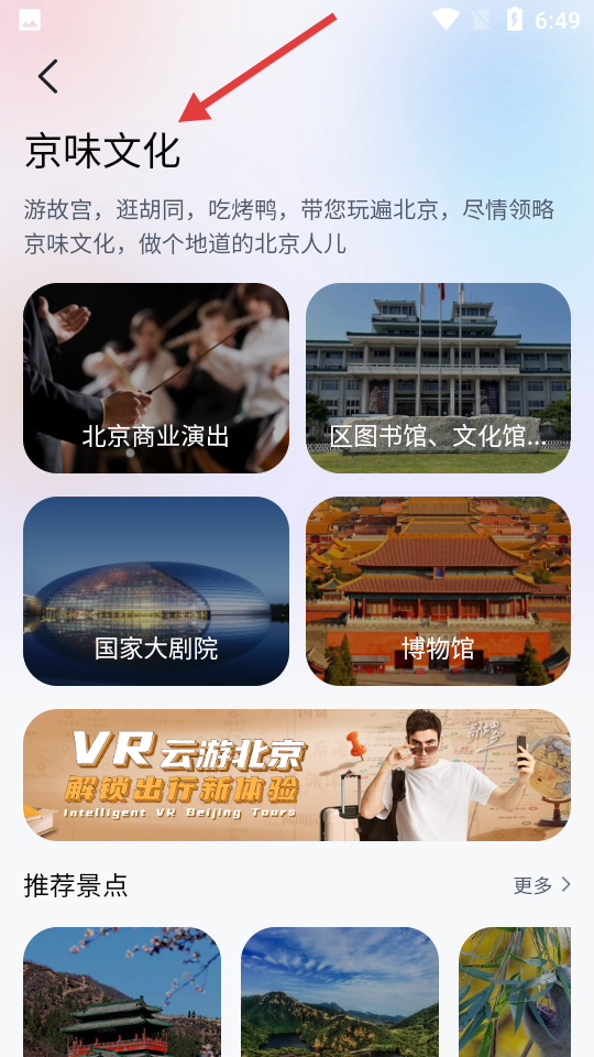 2、京味文化頁(yè)面,邀用戶游故宮等,領(lǐng)略地道京味,含商業(yè)演出、圖書(shū)館等文化場(chǎng)所推薦及VR云游項(xiàng)目。