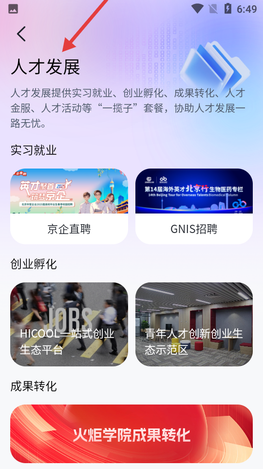 3、人才發(fā)展頁(yè)面,提供實(shí)習(xí)就業(yè)、創(chuàng)業(yè)孵化等一站式服務(wù)有京企直聘、HICOOL創(chuàng)業(yè)平臺(tái)等資源助力人才成長(zhǎng)。