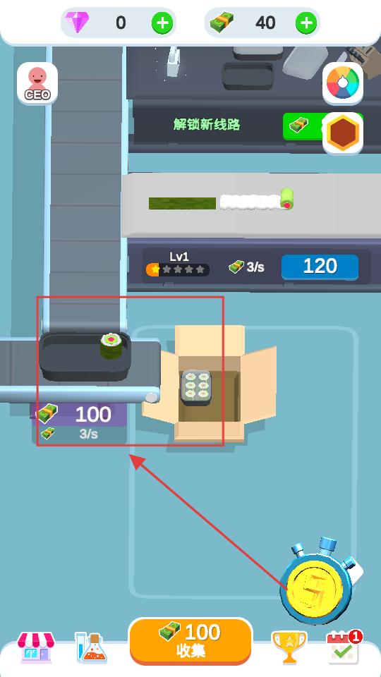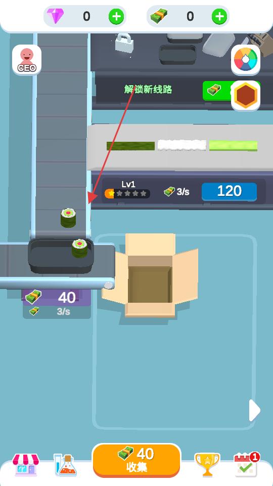 4、加工完成的壽司被傳送至紙箱處進行打包,隨著打包的壽司數量增多,下方的收益數值不斷增長,點擊收集按鈕,獲取生產壽司帶來的收益。