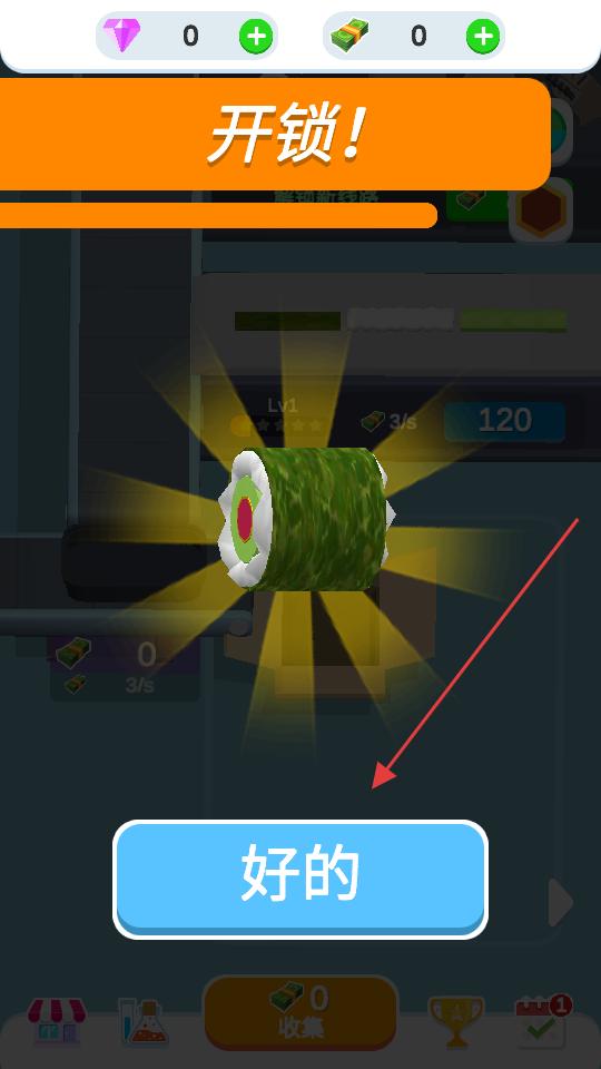 2、解鎖新線路后界面彈出開鎖提示并顯示壽司,點擊好的,確認獲得新的壽司品類,使壽司順利進入傳送環(huán)節(jié),推進生產進程。