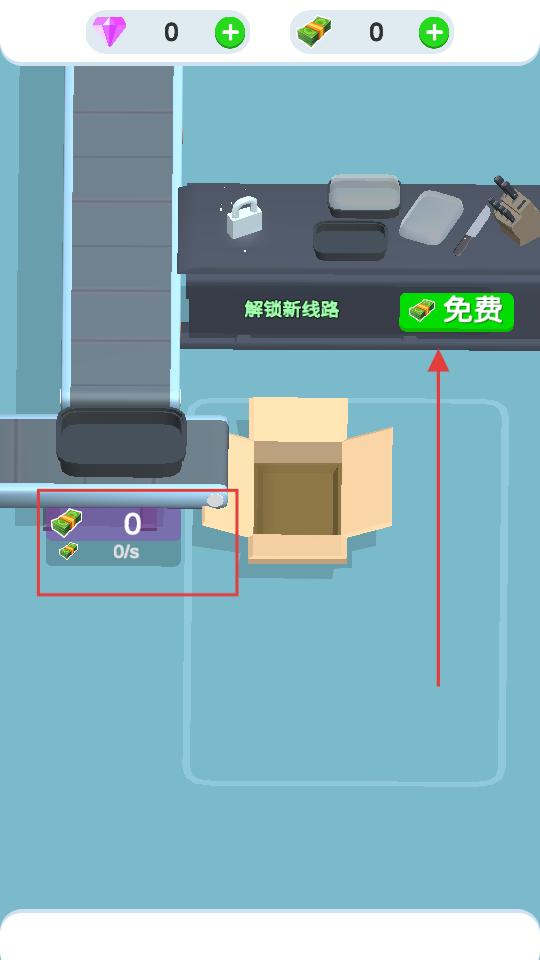 1、進入游戲界面,看到傳送帶與解鎖新線路按鈕,點擊免費解鎖新線路,開啟壽司的生產流程,讓后續(xù)能有更多壽司品類進行加工。