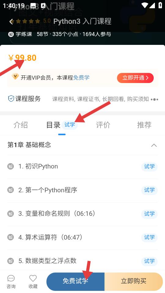 3、Python3入門課程詳情頁看到課程標價,切換至試學標簽頁,瀏覽基礎概念等章節(jié)的試學內(nèi)容,點擊下方免費試學按鈕,即可體驗課程。