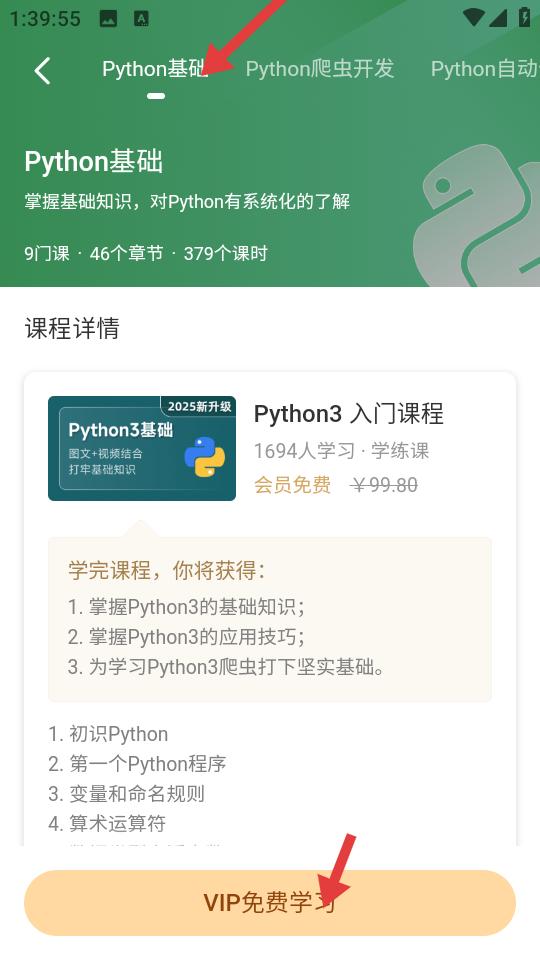 2、基礎課程界面查看課程詳情,知曉Python3入門課程融合圖文與視頻形式,點擊VIP免費學習按鈕,進入課程詳情頁。