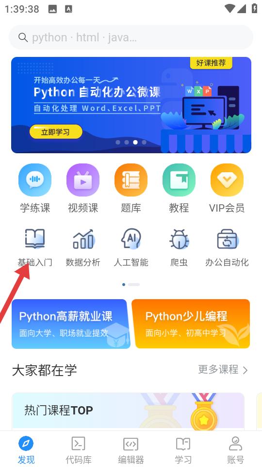 1、首頁在學練課視頻課題庫等功能區(qū)里找到基礎入門板塊,點擊進入Python基礎課程界面,該界面展示課程和章節(jié)課時課程體系。