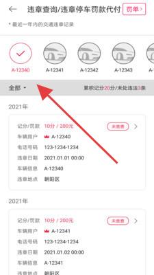 1、違章查詢頁,可篩選車輛,展示近一年違章記錄,含違章時間、地點(diǎn)、扣分罰款等,助車主管理車輛違章。