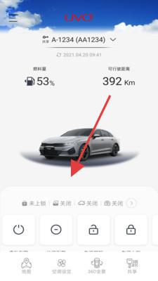 3、車輛控制頁,顯示車輛電量、可行駛里程,下方有鎖車、空調(diào)等遠(yuǎn)程控制按鍵,方便車主遠(yuǎn)距離操控車輛狀態(tài)。