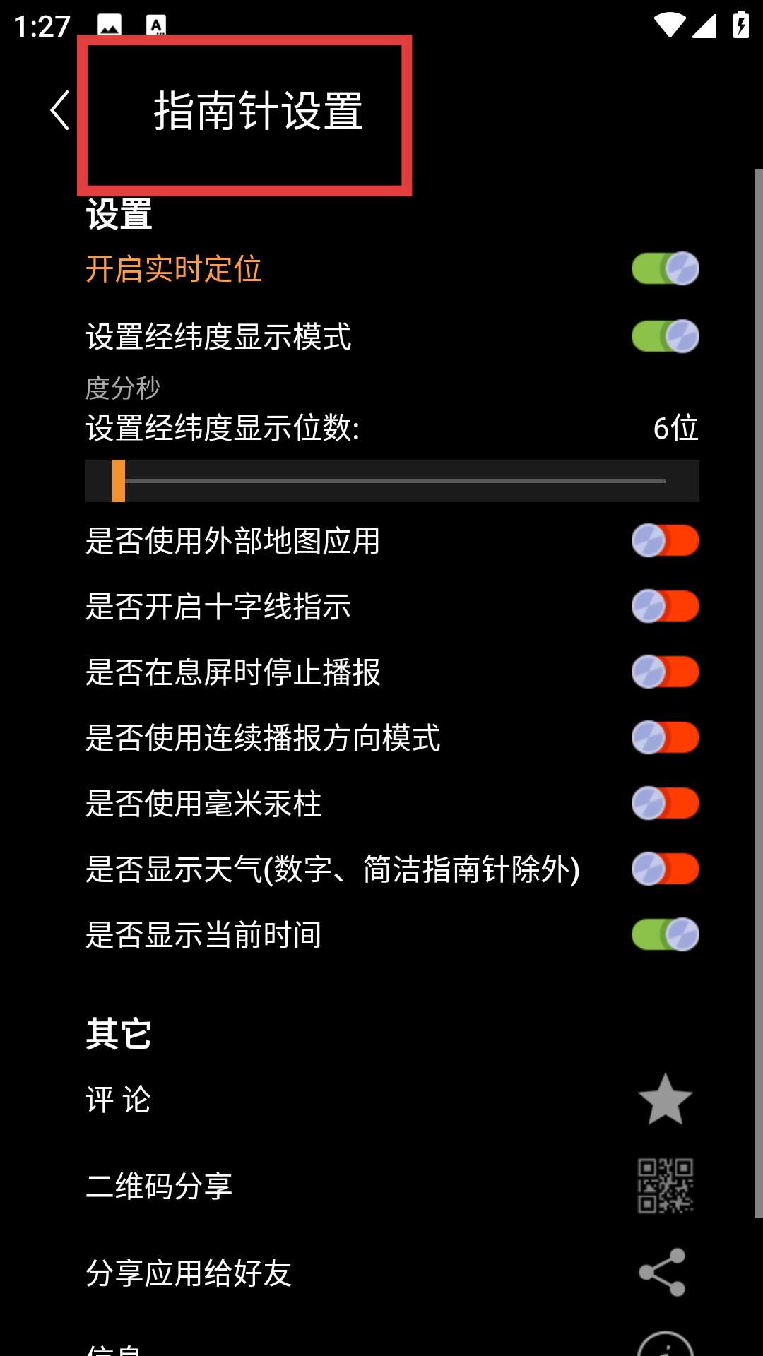 2、進入指南針設置界面,這里可對實時定位、經緯度顯示模式、位數等進行調整,還能設置是否用外部地圖、開啟十字線指示等功能,按需勾選功能優(yōu)化定位體驗。