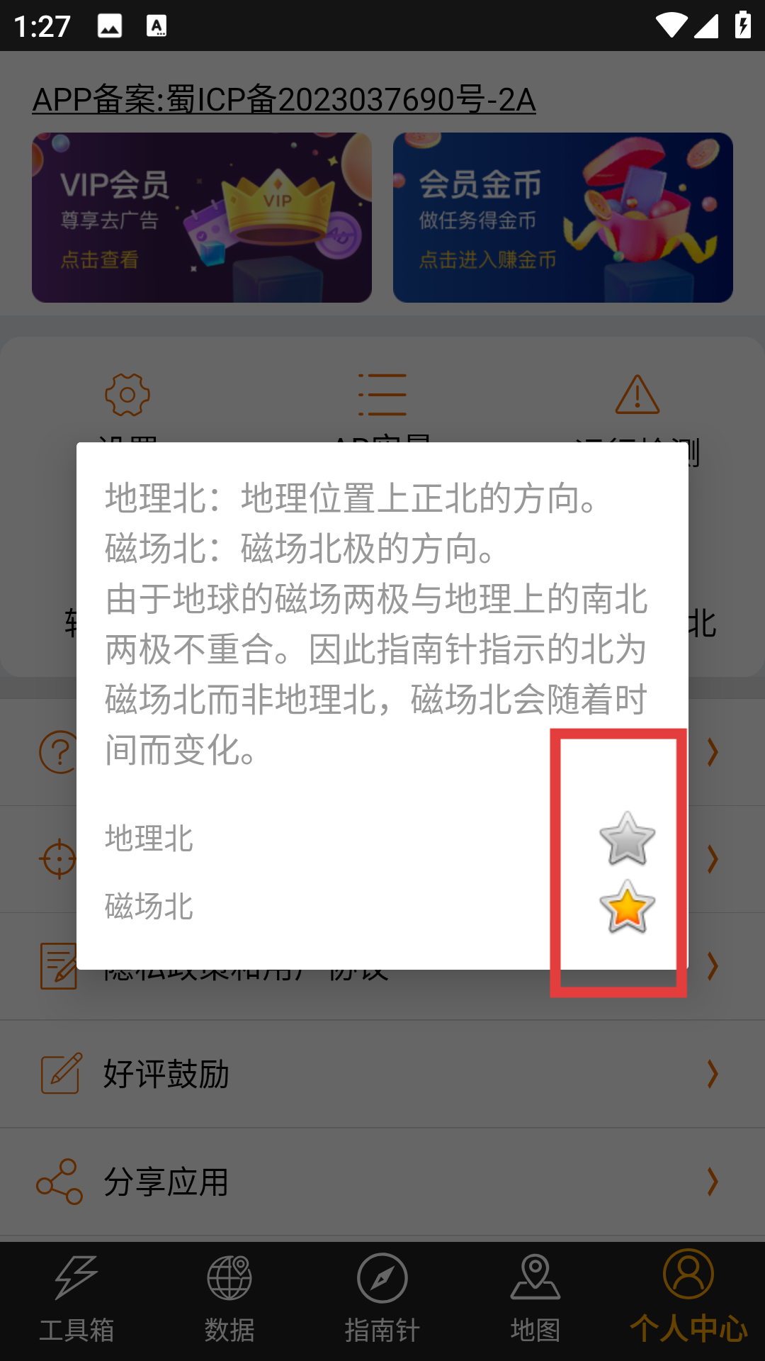 3、點擊設置地理北會彈出說明框,清晰解釋地理北和磁場北區(qū)別,可根據需求選擇地理北或磁場北,點擊對應星星標記切換,讓定位方向更精準契合實際使用場景。