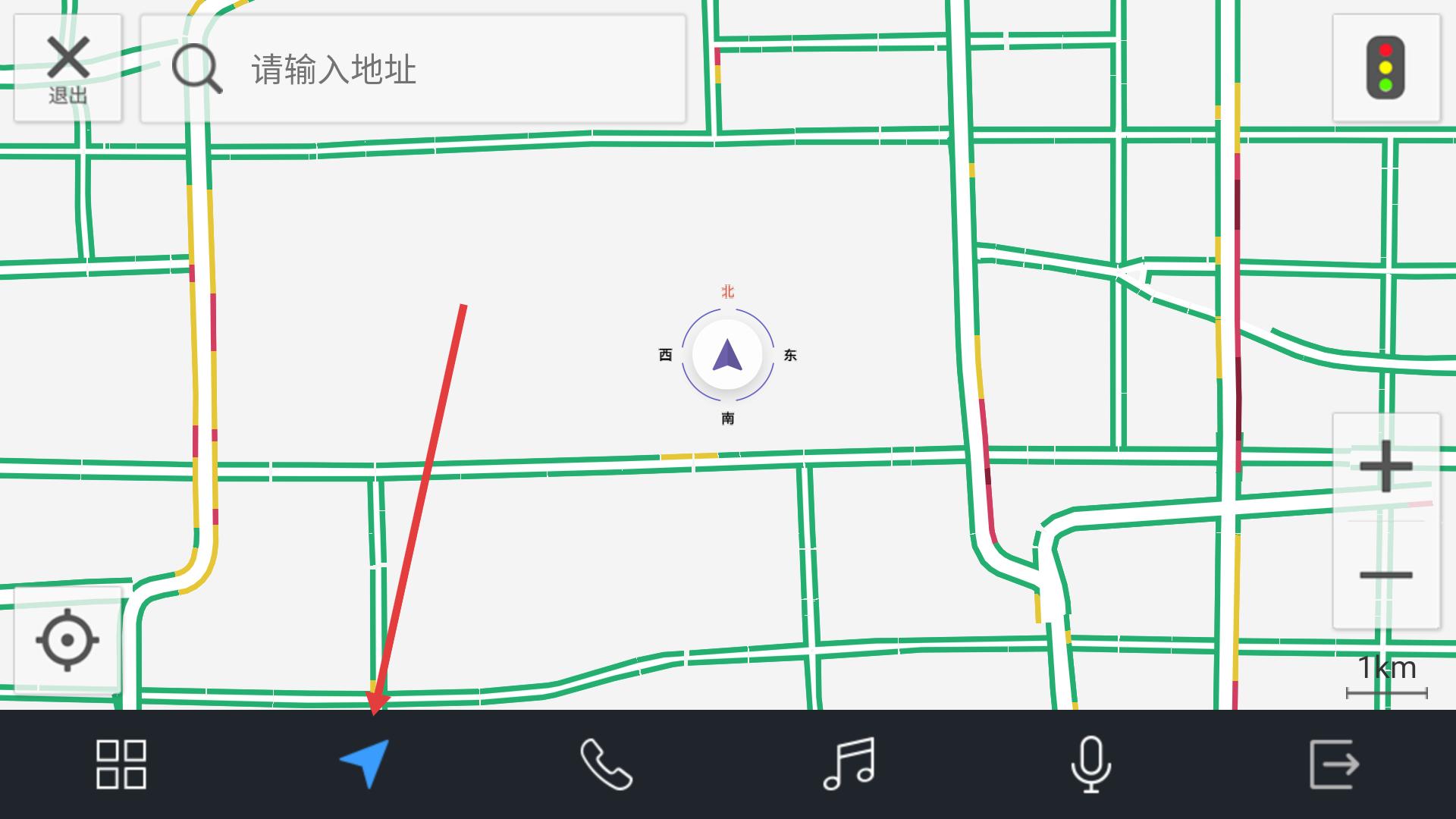1、在主界面點擊左下角藍(lán)色方塊圖標(biāo)應(yīng)用抽屜,進(jìn)入后點導(dǎo)航,在地圖頁可輸入地址搜索,底部箭頭可輔助定位。